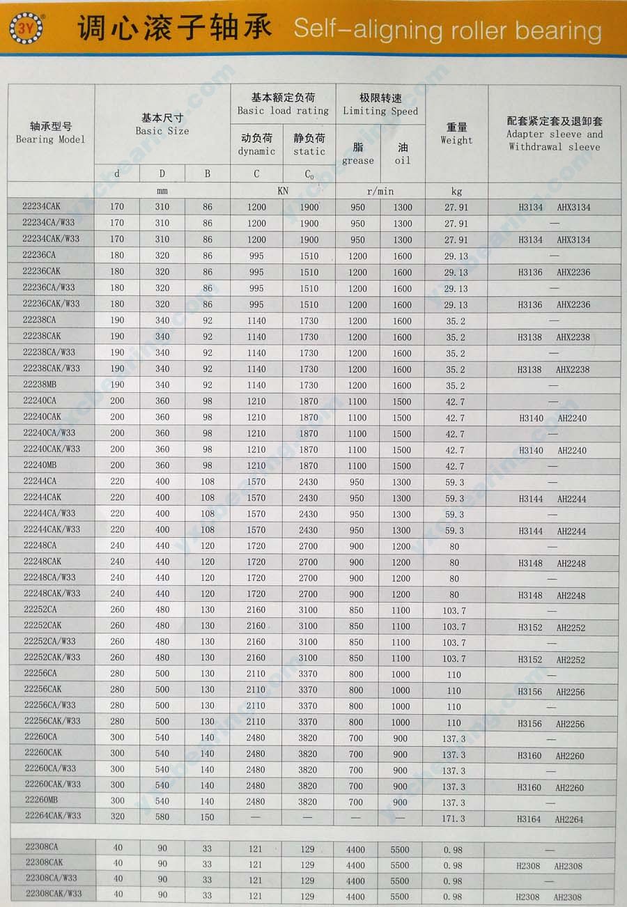 Spherical roller bearings are divided into symmetrical spherical roller and asymmetrical spherical roller according to the shape of the roller cross-section, with asymmetrical spherical roller bearings early products, mainly servicing for the mainframe maintenance. The newly design of the mainframe is rarely used symmetrical spherical roller bearings, which internal structure can withstand greater axial load, compared with the early produced of Spherical roller bearing, after comprehensive improvement and optimization in parameter. The operating temperature of this bearing is lower, so it can adapt to the requirements of higher speed. According to the inner ring with or without baffle and the different cage used, this type of bearing can be divided into type C and type CA, type C is characterized by the inner ring without baffle and the use of steel plate stamping cage, type CA Terrain bearing is characterized by the inner ring on both sides of the baffle and the use of car solid cage. In order to improve the lubrication of the bearings, we can provide the Spherical roller bearing with annular oil groove and three oil holes in the outer ring, which are indicated by the rear code: /W33. In line with the requirements of customers, we can also supply with Spherical roller bearing with oil hole in inner ring. For easy loading and replacing, we can also provide the Spherical roller bearing with a taper in inner hole, with a taper of 1:12, which is indicated by the rear code: K. And to meet the requirements of special users, we also provide bearings with inner hole taper of 1:30, indicated by the rear code: K30. Bearings with taper in inner hole can be installed onto the tapered journal by the locking nut or mounted on the cylindrical journal with the help of adapter sleeve or withdrawal sleeve. In order to prevent some harmful slip between the raceway and roller caused by the centrifugal effect in high-speed operation, the bearing should bear a certain minimum radial load, the size can be estimated according to the following formula: